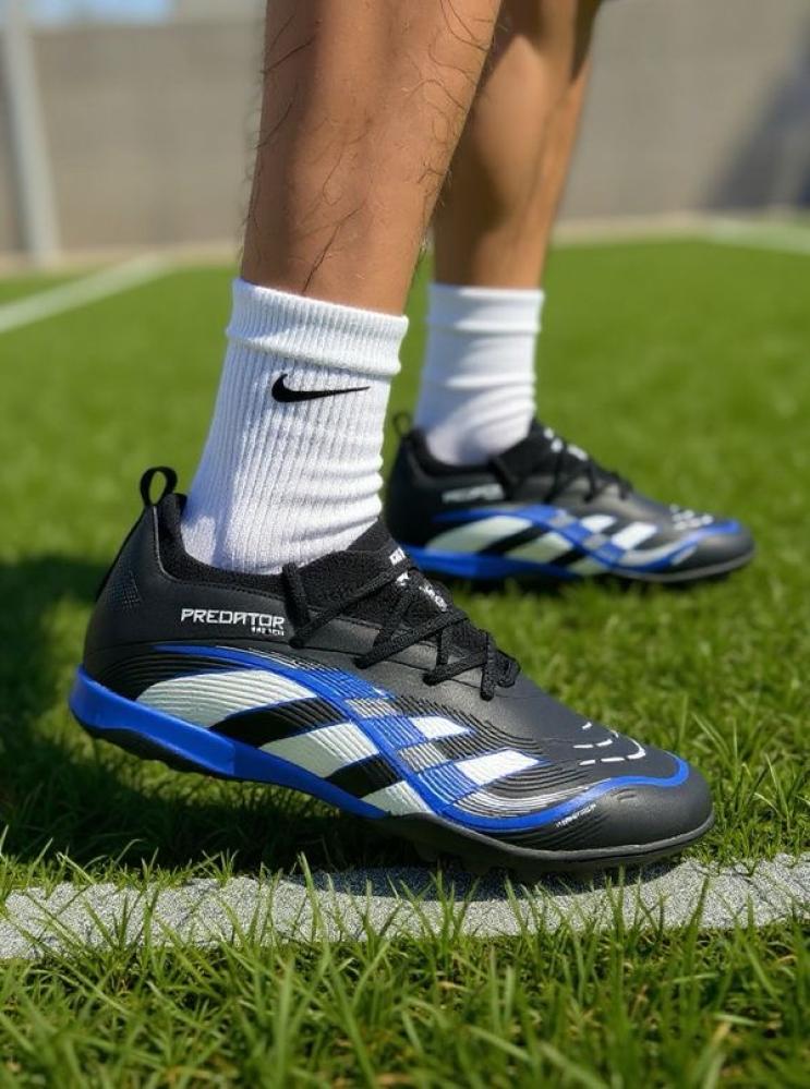 اجعل طفلك يلمع في الملعب مع بوت Predator الذي يجمع بين الأداء العالي والمظهر الأنيق. باللون الأسود مع لمسات فضية وزرقاء تمنحه طابعاً رياضياً احترافياً يلفت الأنظار.