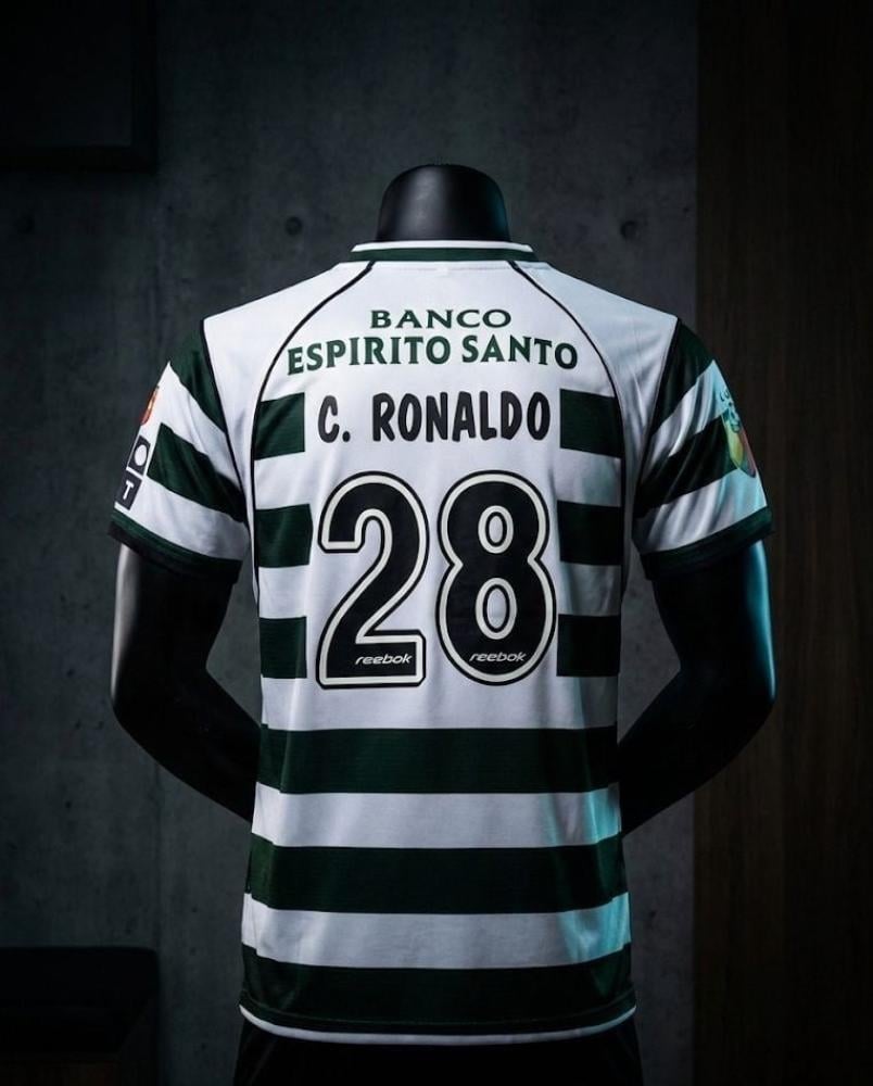تيشيرت سبورتينغ لشبونة الكلاسيكي (2002/2003) يحمل اسم رونالدو برقم 28. قطعة تاريخية نادرة تُمثل انطلاقة الأسطورة. اطلبها الآن في القصيم!
