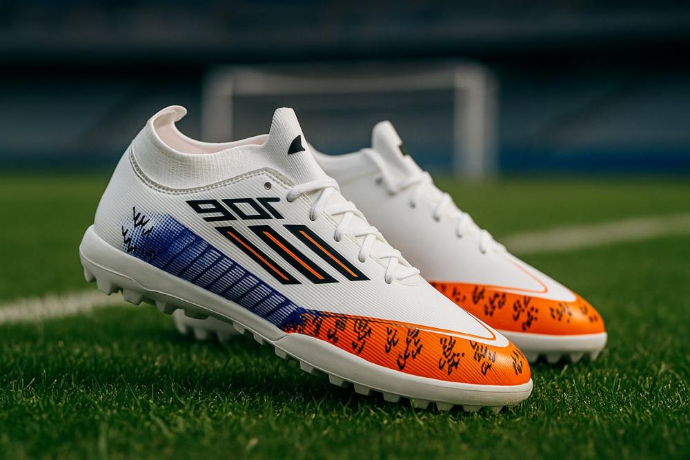 👟 بوت كرة قدم ولادي – أبيض × برتقالي × أزرق